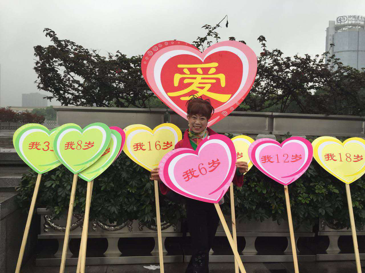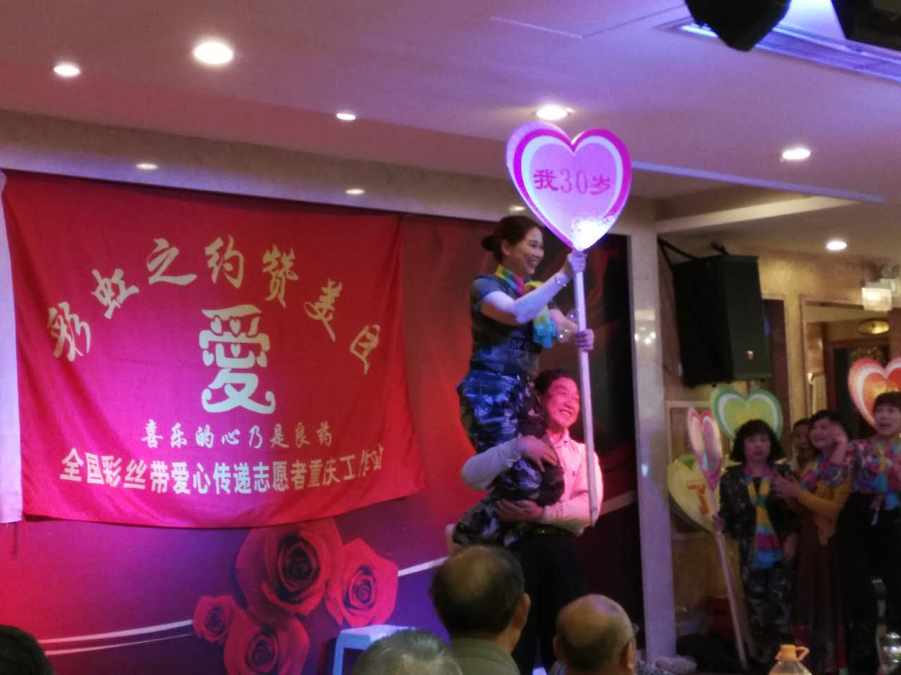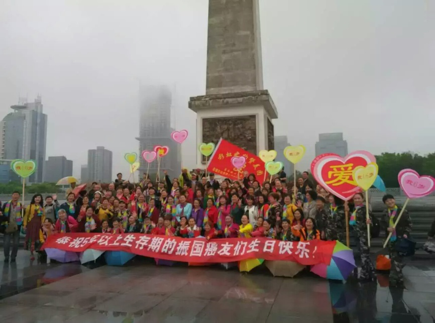 2016年4月10日,全國彩絲帶愛心傳遞重慶工作站的志愿者們?cè)趦山腋V場(chǎng)為重慶病友(5年以上癌齡)舉辦了一場(chǎng)特別的集體生日,百名癌癥患者齊唱《生日歌》,大呼“我們活了!”