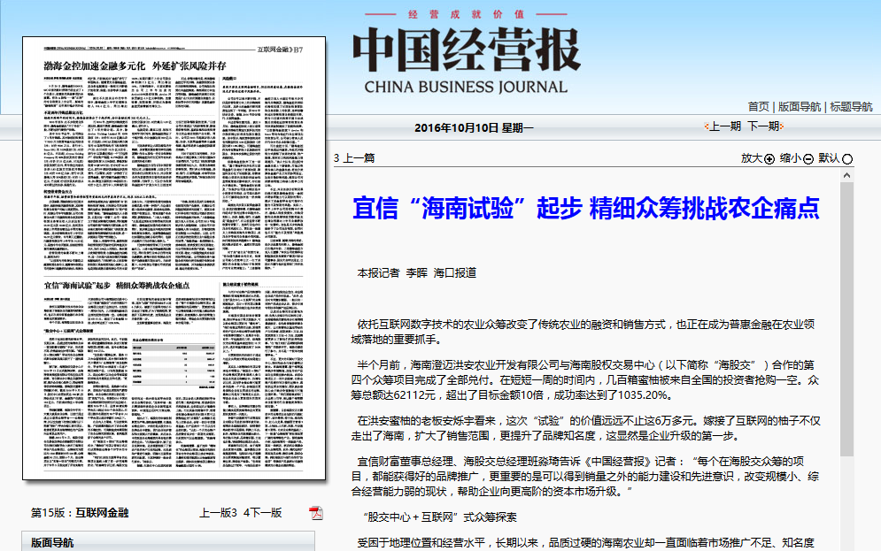 近日,國內(nèi)最早發(fā)行經(jīng)濟(jì)類的報刊之一《中國經(jīng)營報》在其互聯(lián)網(wǎng)金融版上報道“眾籌海南”,文章以《宜信“海南試驗”起步 精細(xì)眾籌挑戰(zhàn)農(nóng)企痛點(diǎn)》為題,表示依托互聯(lián)網(wǎng)數(shù)字技術(shù)的農(nóng)業(yè)眾籌改變了傳統(tǒng)農(nóng)業(yè)的融資和銷售方式,也正在成為普惠金融在農(nóng)業(yè)領(lǐng)域落地的重要抓手。
