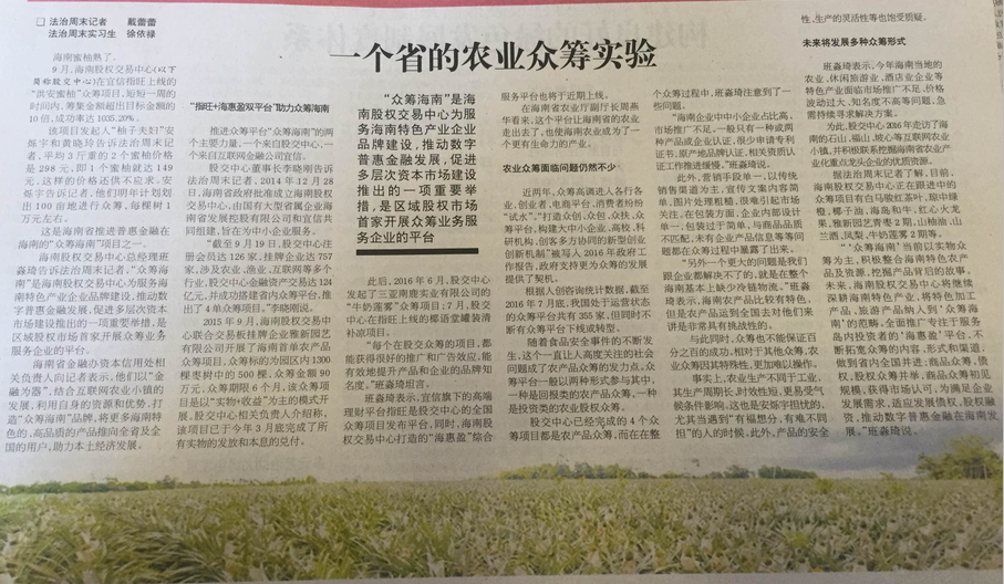 “眾籌海南”作為海南股權(quán)交易中心推動海南特色產(chǎn)業(yè)發(fā)展的一項(xiàng)重要舉措,持續(xù)受到媒體關(guān)注。最近,面向全國公開發(fā)行的具有鮮明法治特色的中央級主流政經(jīng)周報——《法治周末》以半版篇幅刊發(fā)了《一個省的農(nóng)業(yè)眾籌實(shí)驗(yàn)》專題文章。