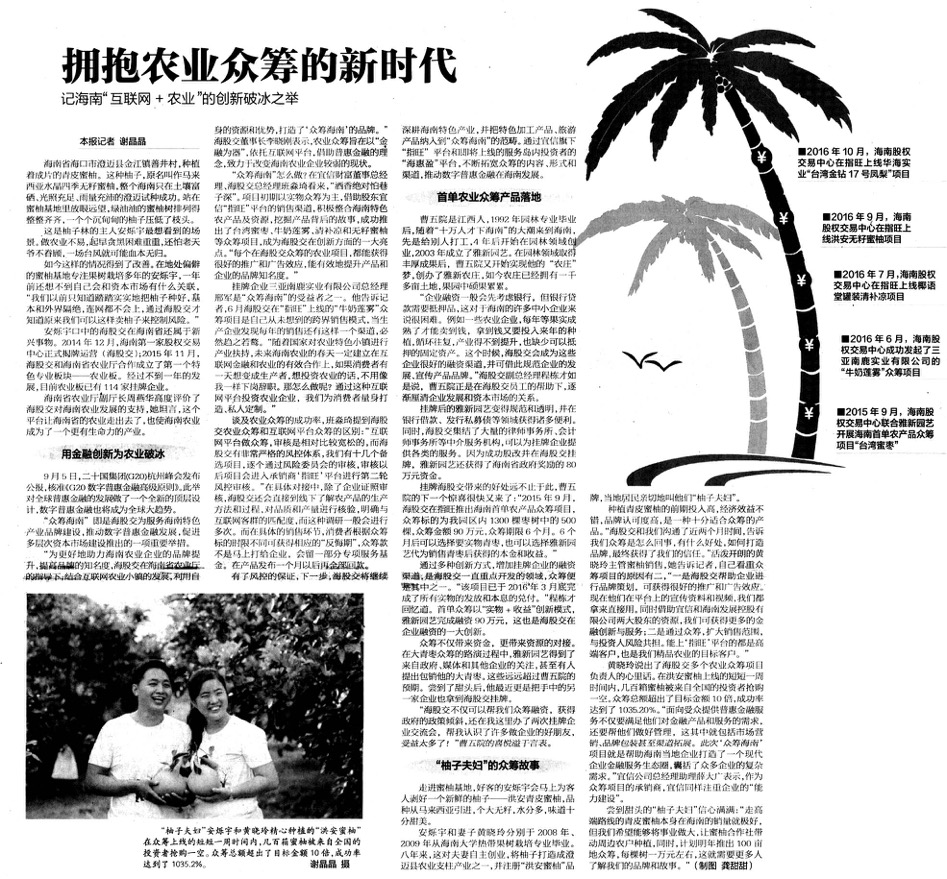 中國人民銀行唯一直屬刊物《金融時(shí)報(bào)》近整版報(bào)道了海南股權(quán)交易中心“眾籌海南”項(xiàng)目,文章以《擁抱農(nóng)業(yè)眾籌的新時(shí)代 記海南“互聯(lián)網(wǎng)+農(nóng)業(yè)”的創(chuàng)新破冰之舉》為題,圍繞數(shù)字普惠金融、“互聯(lián)網(wǎng)+農(nóng)業(yè)”創(chuàng)新等內(nèi)容展開。