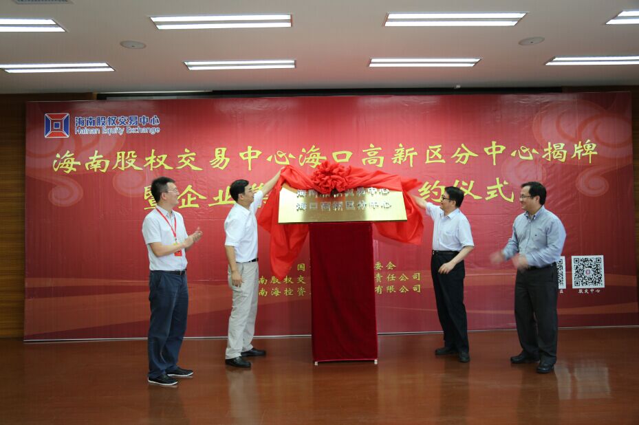 隨后,省科技廳黨組書記葉振興書記、省金融辦鄧傳明主任、??趪腋咝聟^(qū)黨委書記顧剛書記和海南股交中心李曉剛董事長共同為海南股權(quán)交易中心高新區(qū)分中心揭牌。
