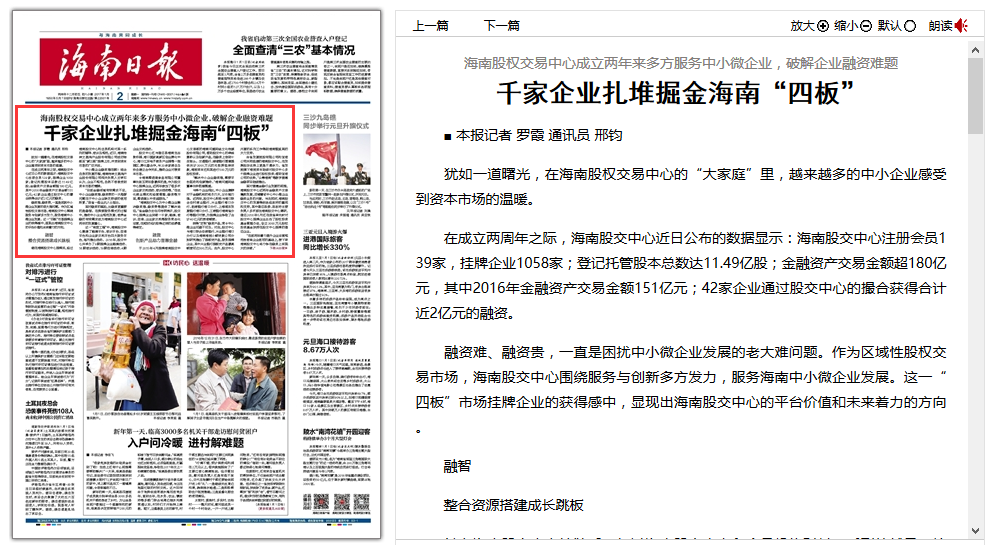 1月2日,海南日?qǐng)?bào)頭版頭條刊發(fā)海南股權(quán)交易中心成立兩周年文章,關(guān)注股交中心成立兩周年。