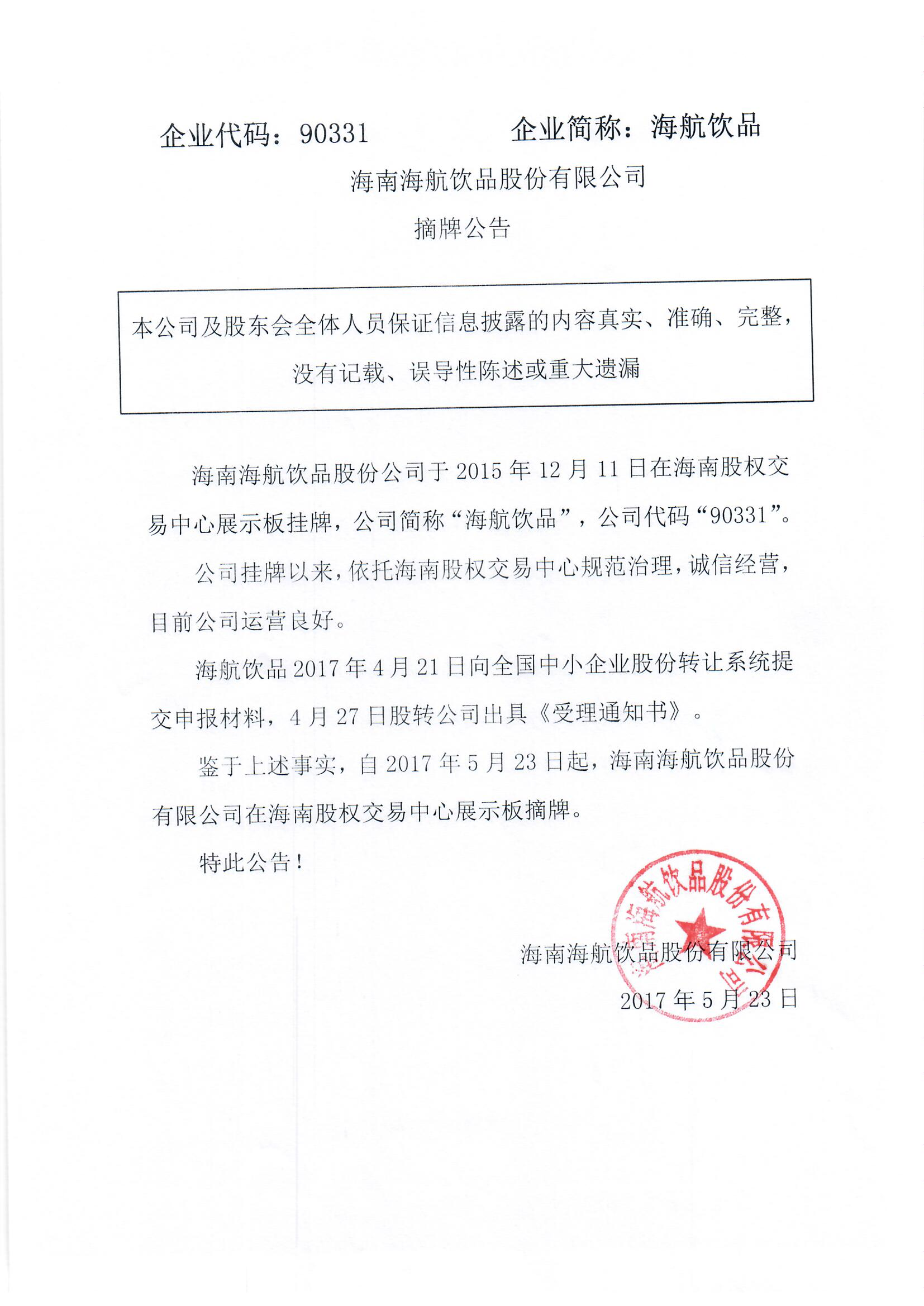 90331海航飲品:海南海航飲品股份有限公司摘牌公告