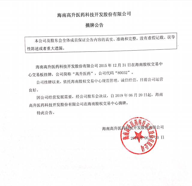 80032高升醫(yī)藥:海南高升醫(yī)藥科技開發(fā)股份有限公司摘牌公告