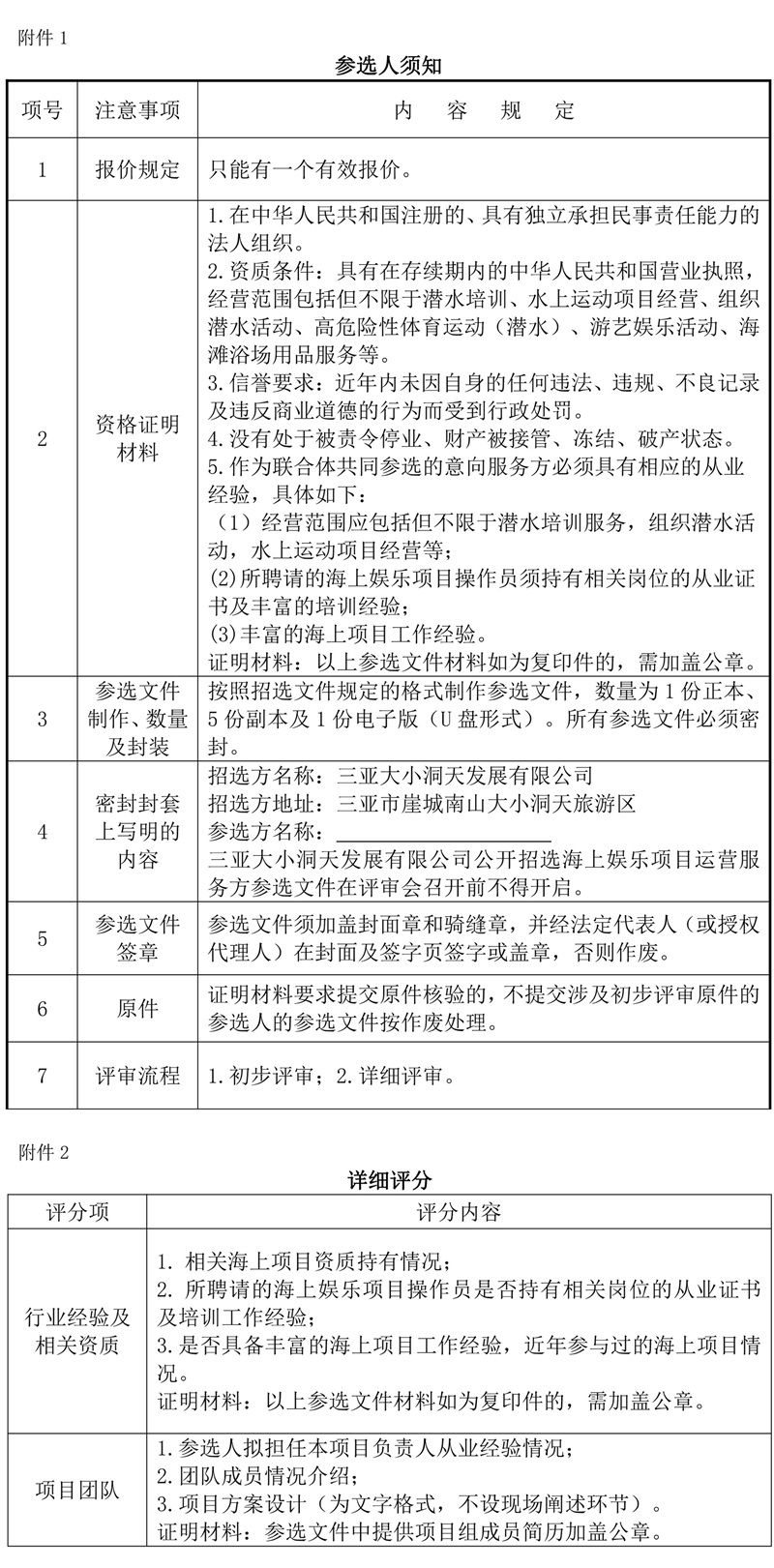 根據(jù)相關(guān)法律法規(guī),受委托,海南股權(quán)交易中心有限責(zé)任公司公開招選海上娛樂(lè)項(xiàng)目運(yùn)營(yíng)服務(wù)方,為三亞大小洞天景區(qū)的海上娛樂(lè)項(xiàng)目提供盡職調(diào)查、方案設(shè)計(jì)、項(xiàng)目報(bào)批、安裝、調(diào)試、驗(yàn)收及運(yùn)營(yíng)管理等服務(wù)工作。歡迎符合條件的機(jī)構(gòu)遵照本公告的有關(guān)規(guī)定報(bào)名參加,現(xiàn)將有關(guān)事項(xiàng)公告如下: