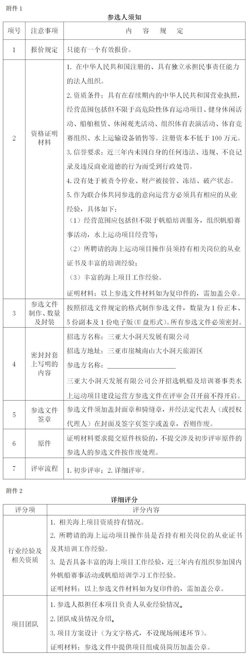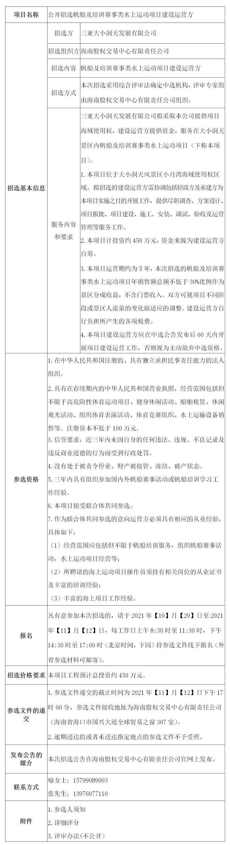 根據(jù)相關(guān)法律法規(guī),受委托,海南股權(quán)交易中心有限責(zé)任公司公開招選帆船及培訓(xùn)賽事類水上運(yùn)動(dòng)項(xiàng)目建設(shè)運(yùn)營(yíng)方,為三亞大小洞天景區(qū)的帆船及培訓(xùn)賽事類水上運(yùn)動(dòng)項(xiàng)目提供盡職調(diào)查、方案設(shè)計(jì)、項(xiàng)目報(bào)批、項(xiàng)目建設(shè)、施工、安裝、調(diào)試、驗(yàn)收及運(yùn)營(yíng)管理等服務(wù)工作。歡迎符合條件的機(jī)構(gòu)遵照本公告的有關(guān)規(guī)定報(bào)名參加,現(xiàn)將有關(guān)事項(xiàng)公告如下: