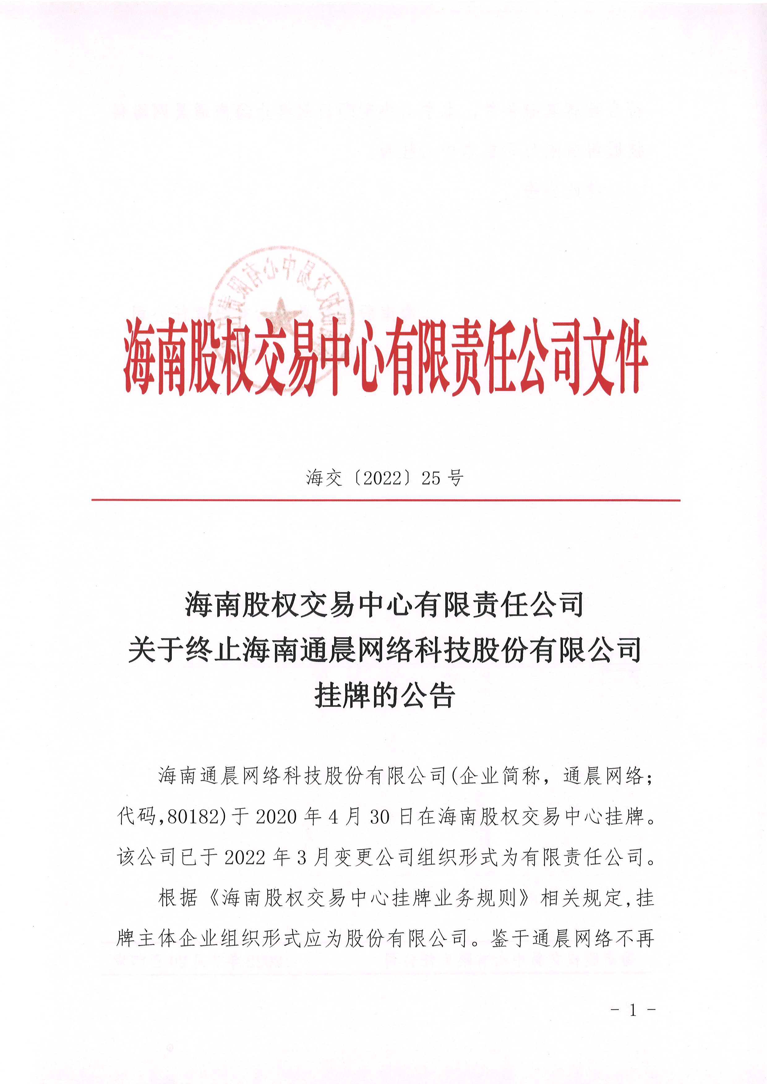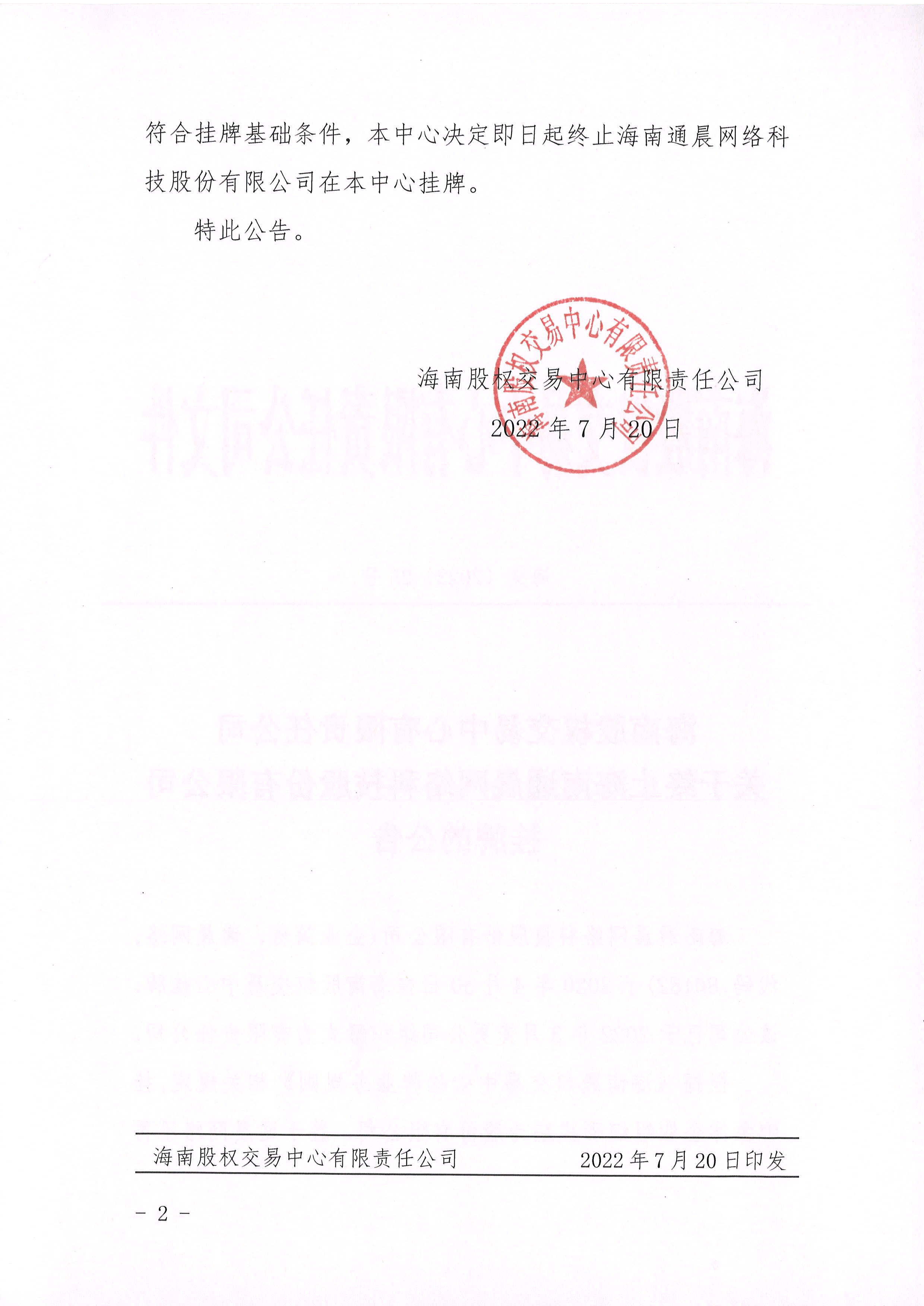 海南股權(quán)交易中心有限責任公司關(guān)于終止海南通晨網(wǎng)絡(luò)科技股份有限公司掛牌的公告