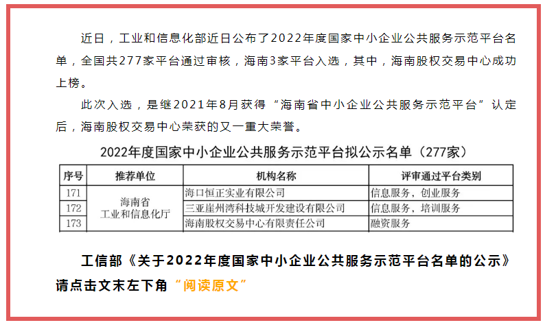 此次獲評國家中小企業(yè)公共服務示范平臺,是對海南股權交易中心服務省內(nèi)中小微企業(yè)工作的認可,也是對海南股權交易中心未來開展各項培育、融資和創(chuàng)新服務舉措的極大鼓舞。